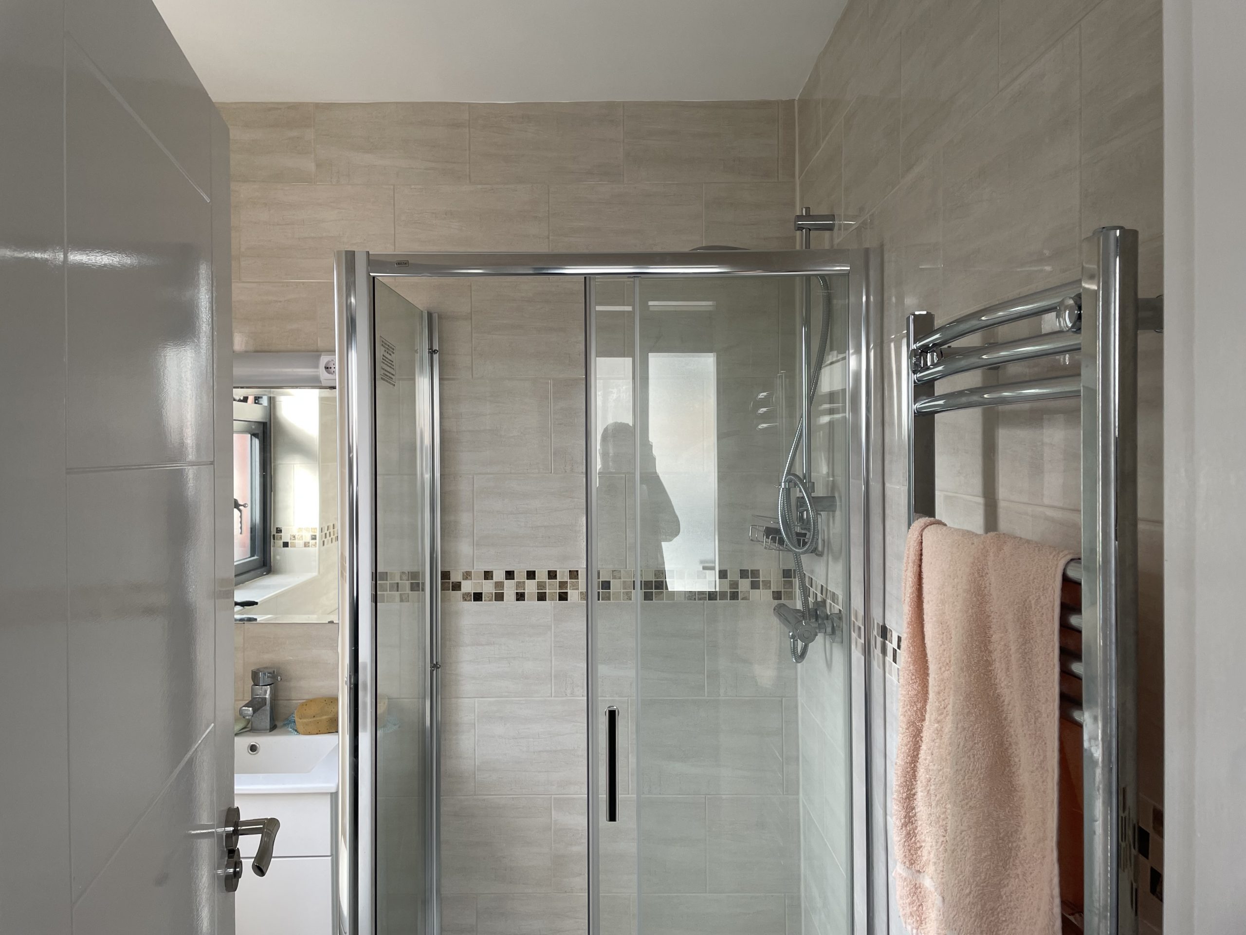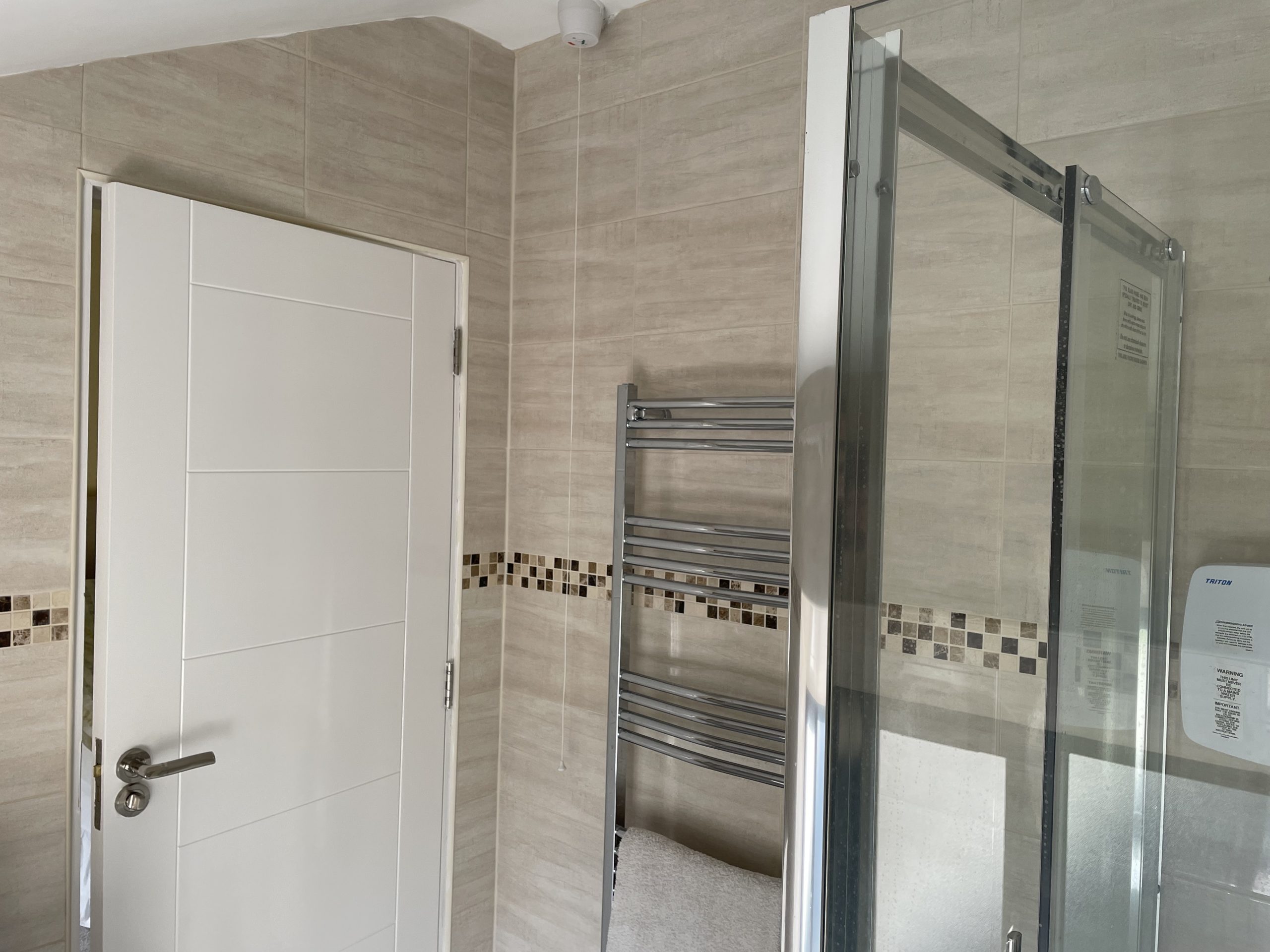 Shower Room: 1.88m 1.68m, With Tiled floor to ceiling, shower unit, WC, WHB with vanity unit, heated towel rail.