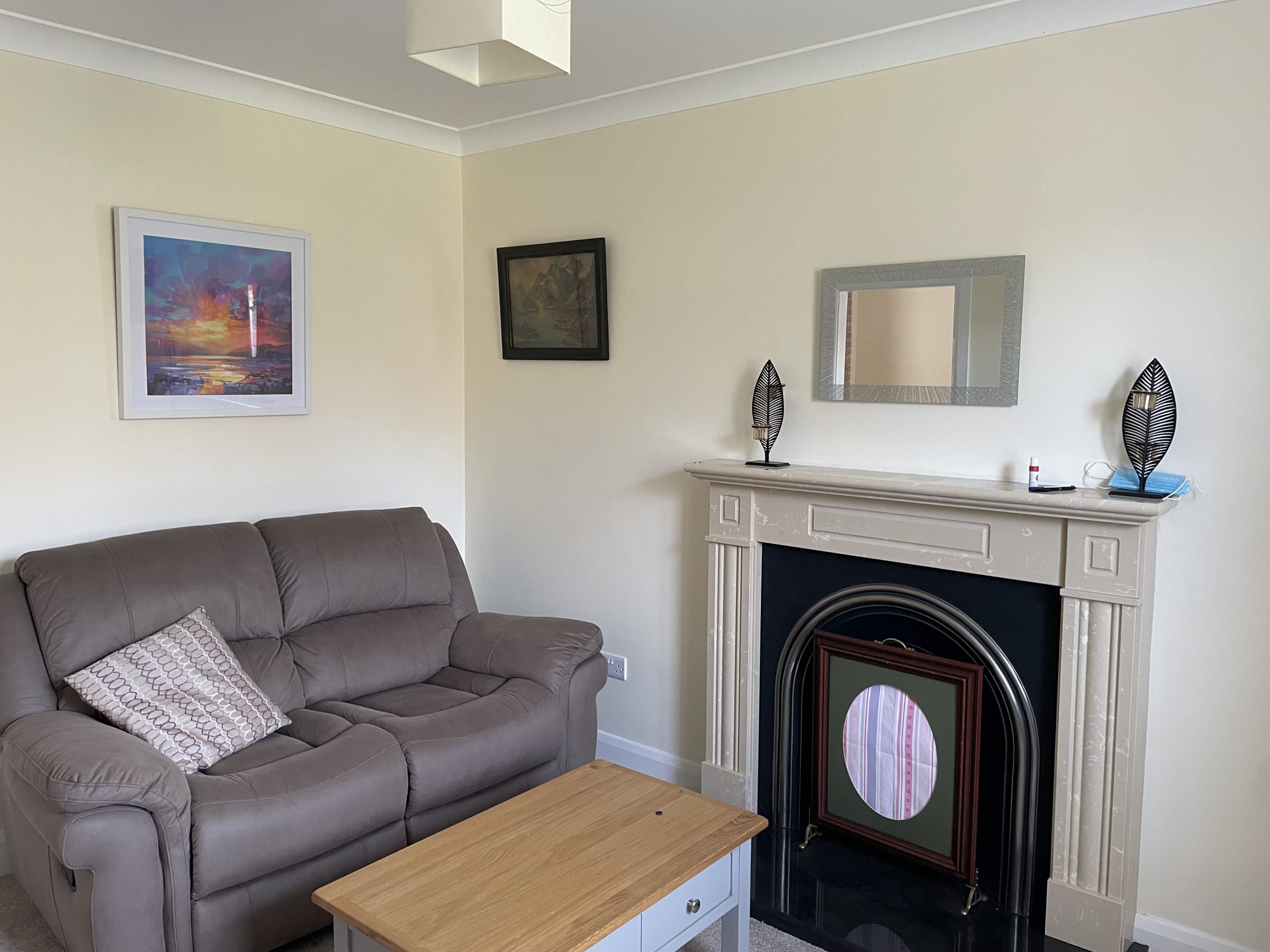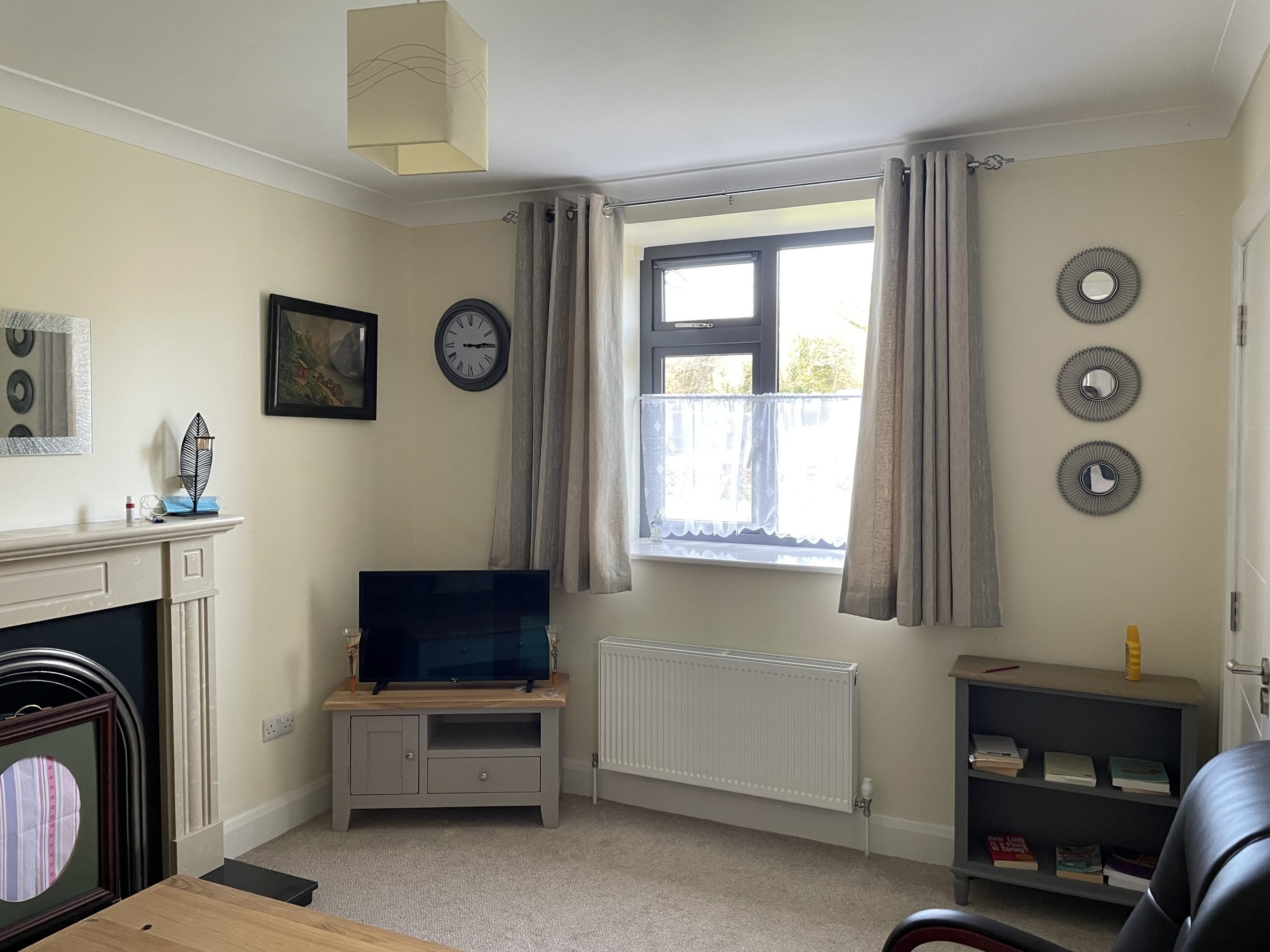 Living Room: 3.84m x 3.08m, Bright room with carpet flooring, open fireplace.