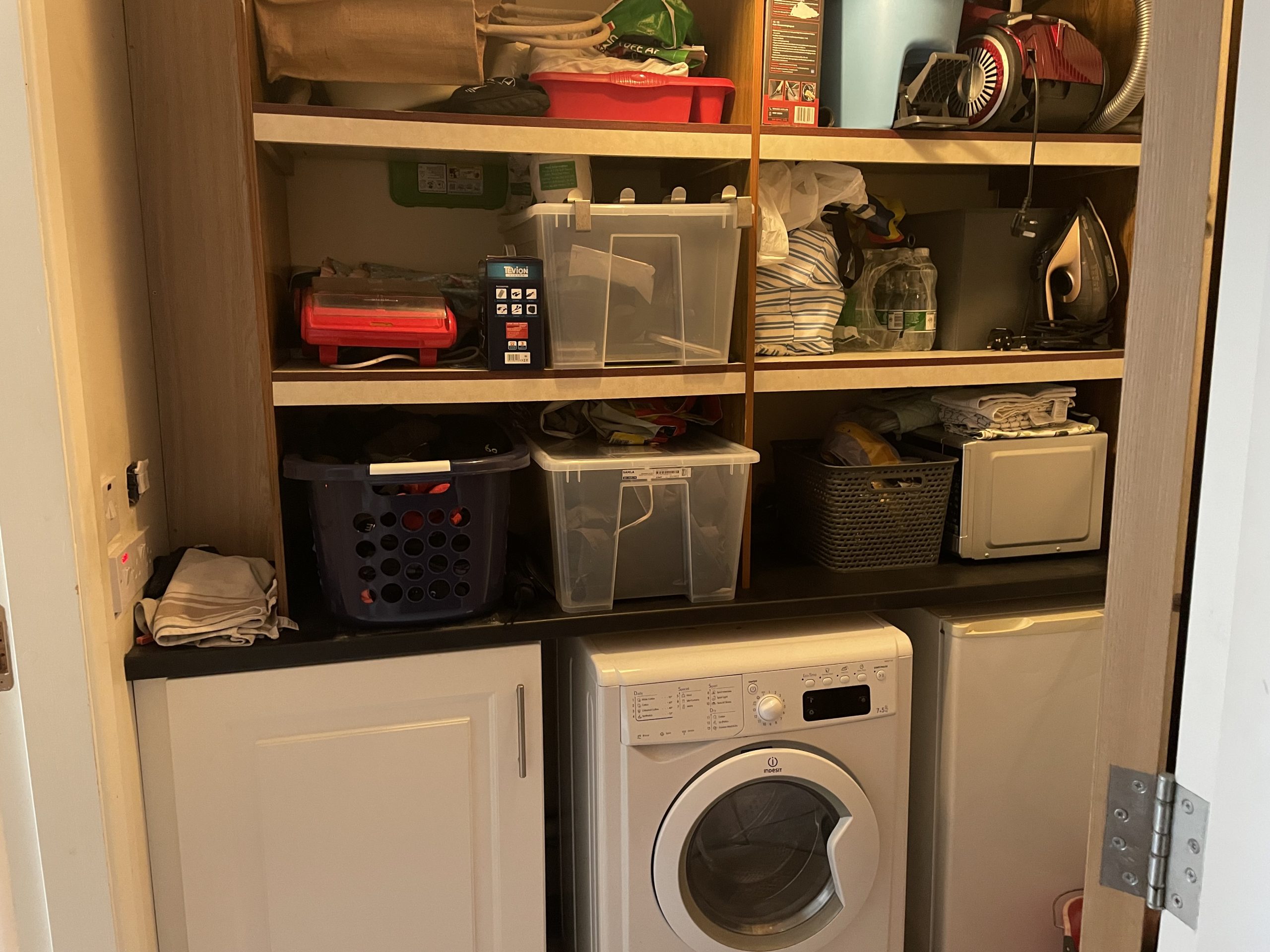 Utility Room: 1.95m 1.40m, Tiled flooring, plumbed for washing machine, storage shelves.
