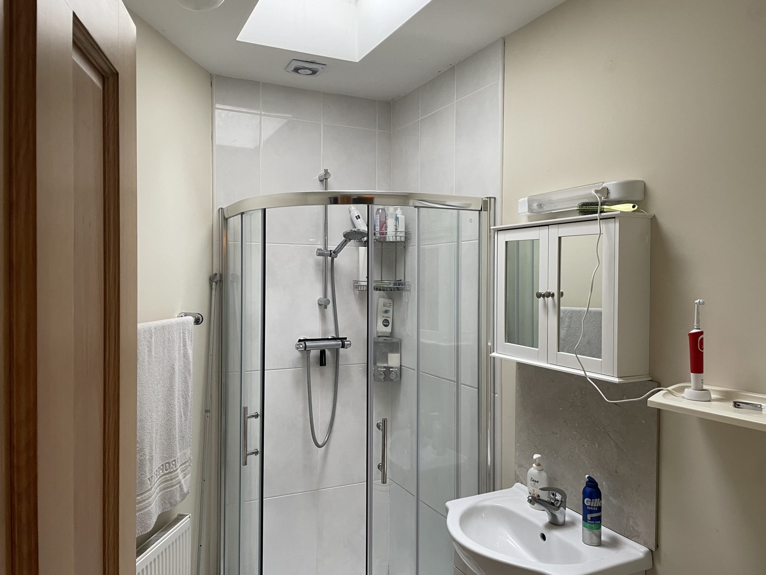 Downstairs Shower Room: 2.36m x 1.66m, Partly tiled, shower, wash hand basin.