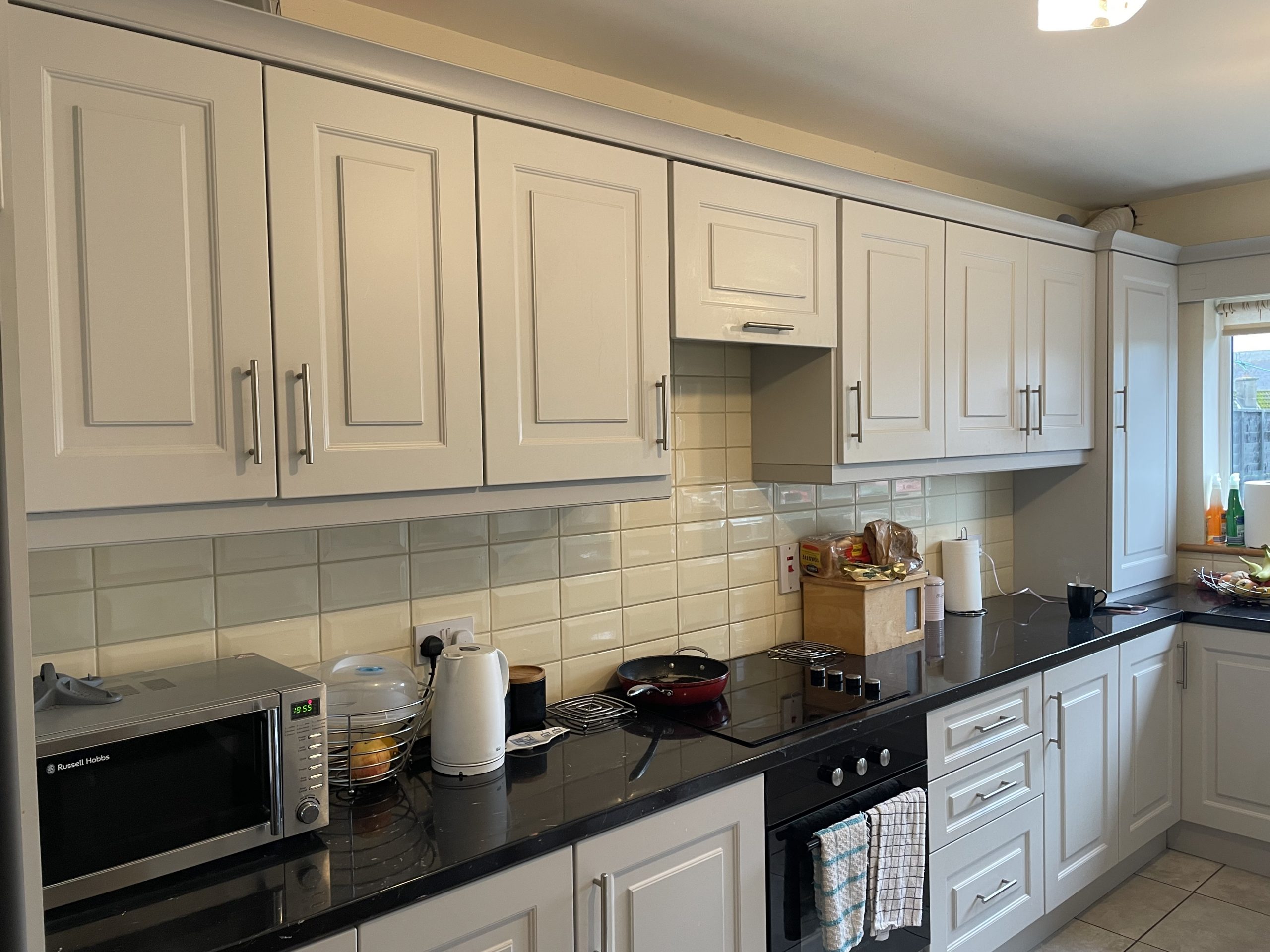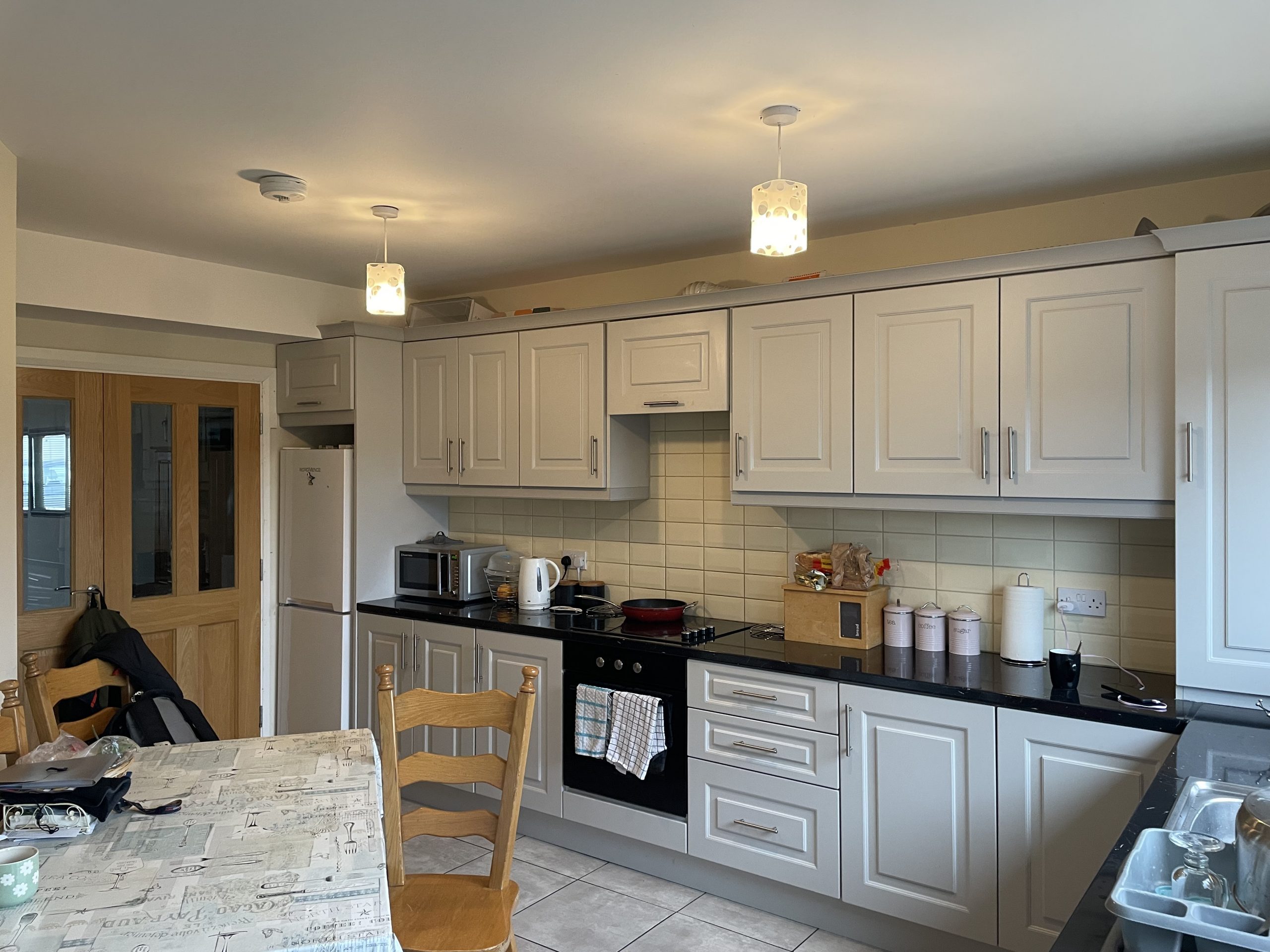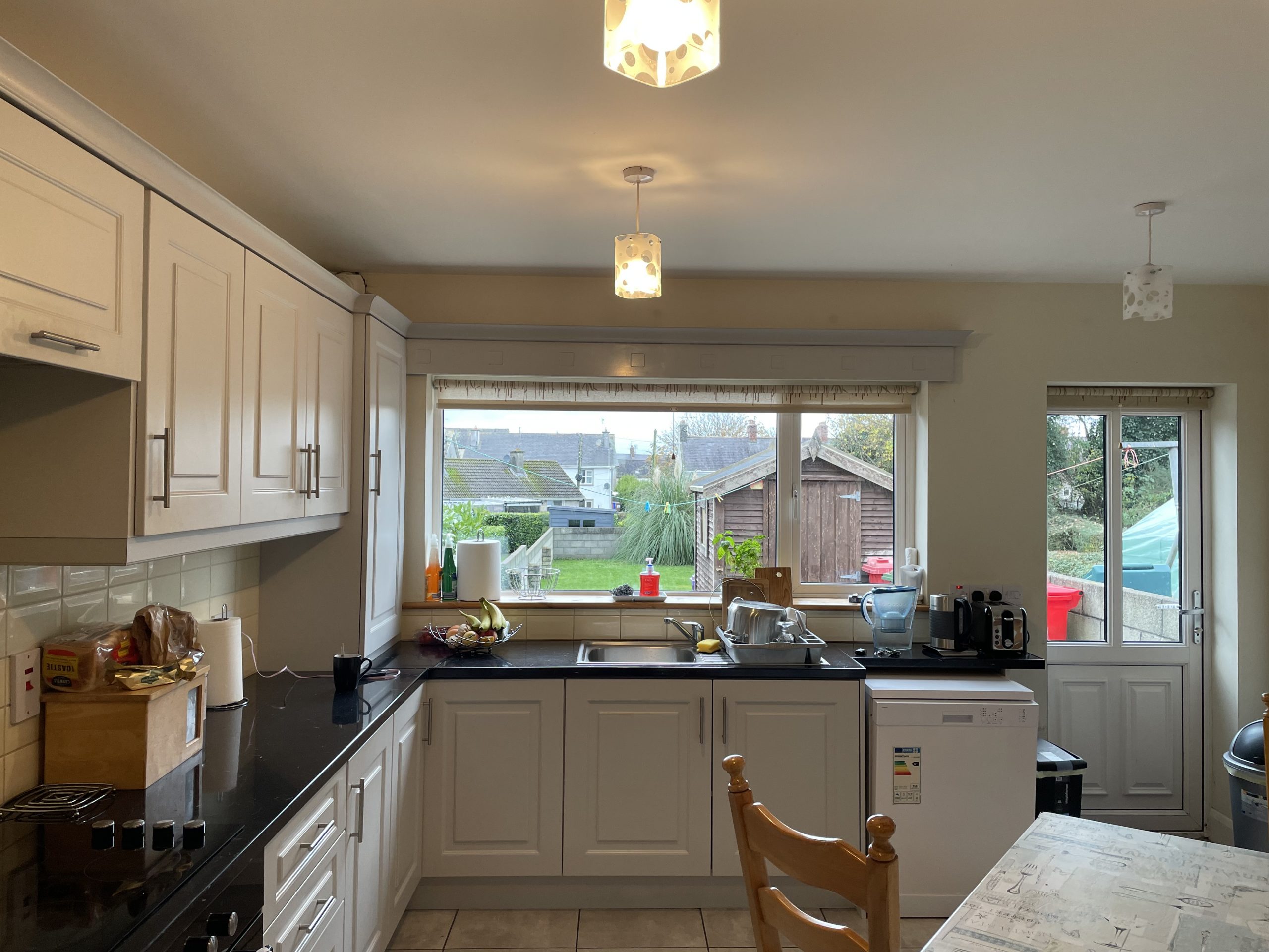 Kitchen: 4.15m x 4.10m, Fully fitted with floor & eye level units, plumbed for dishwasher, built in oven & hob, tiled splashback, access to rear garden.