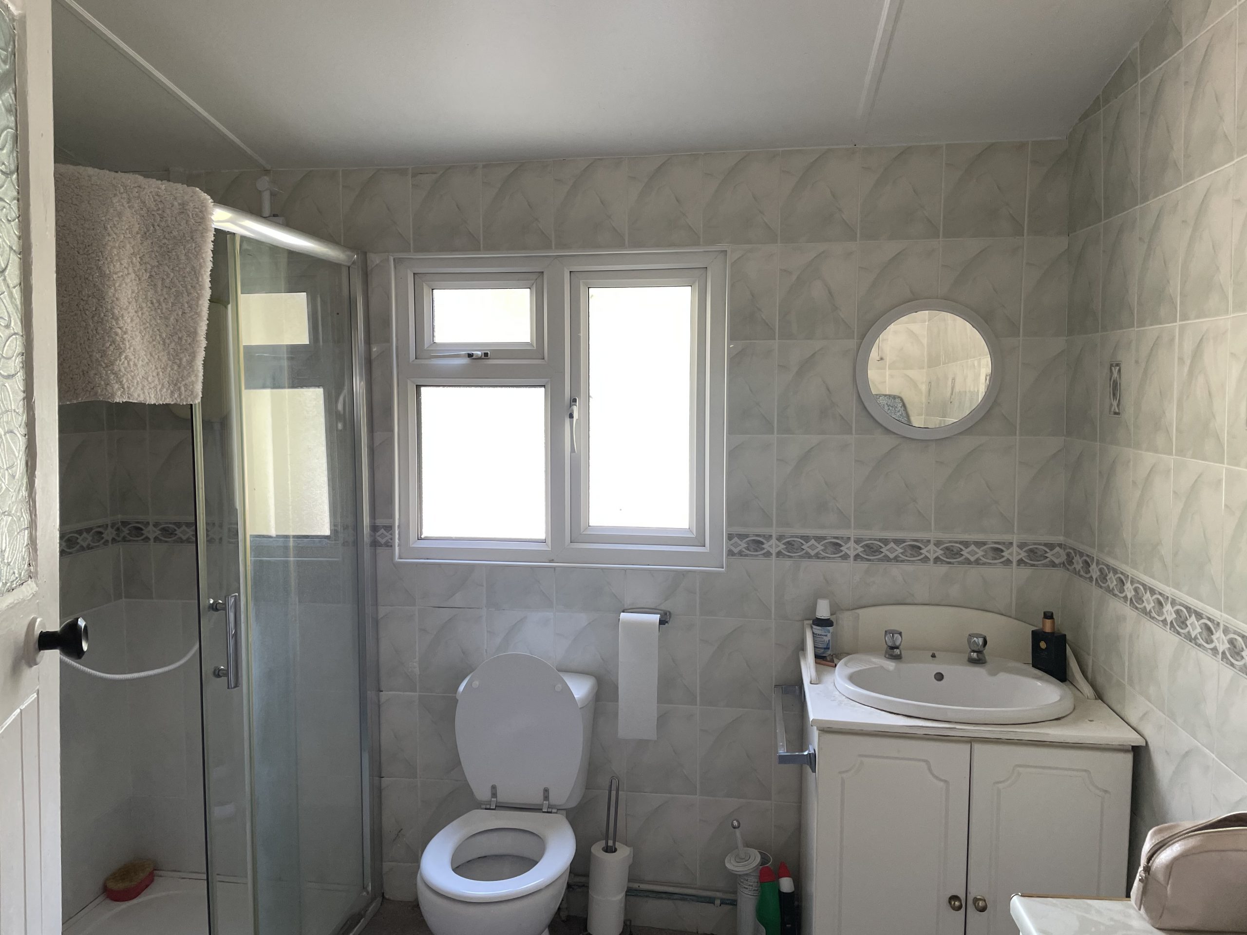 Bathroom: 2.64m x 2.28m, Fully tiled with electric shower, whb with vanity unit and wc.