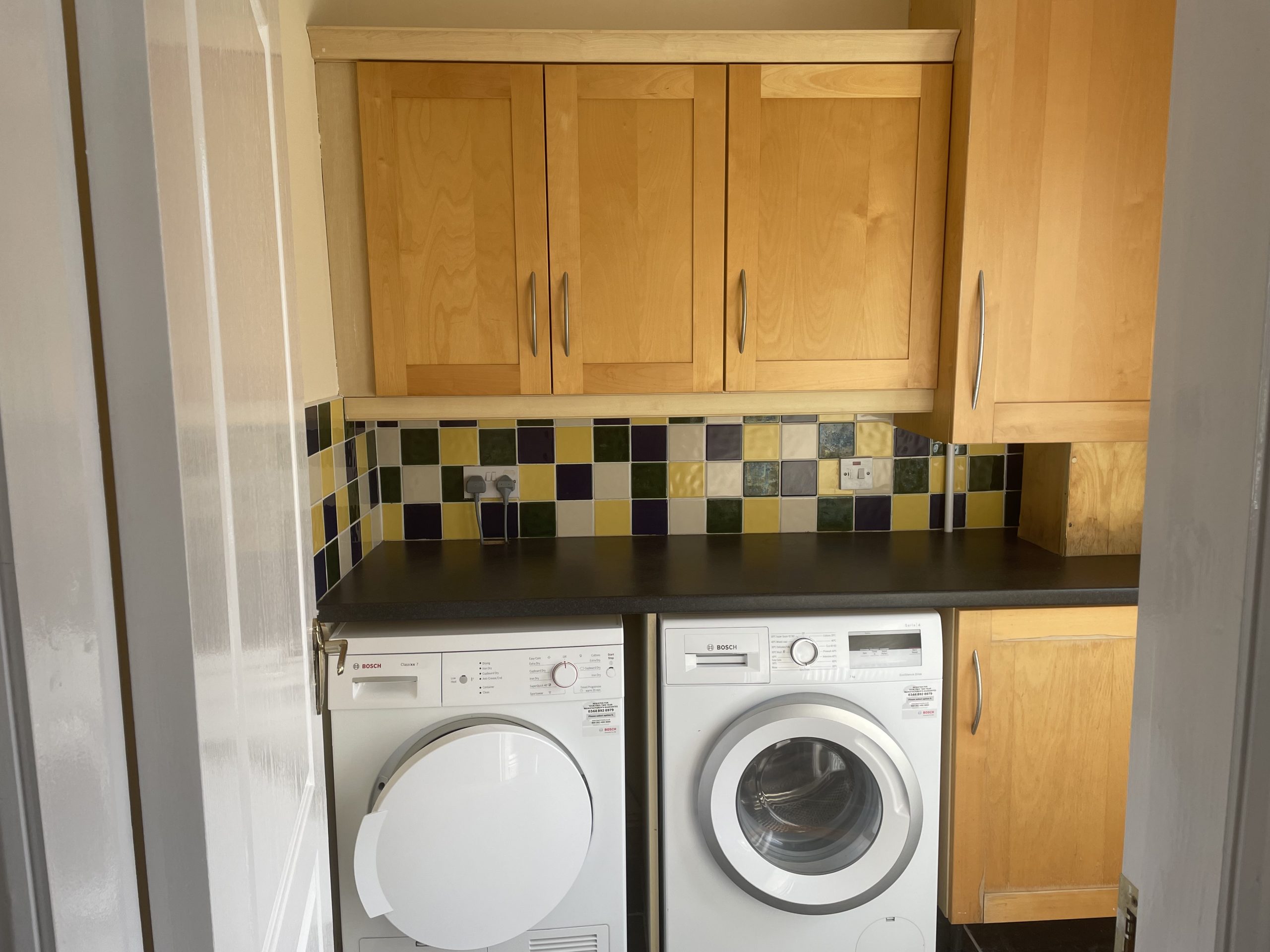 Utility Room: 1.99m x 1.82m, With tiled flooring, tiled splashback, floor & eye level units, plumbed for washing machine & dryer, access to rear garden.