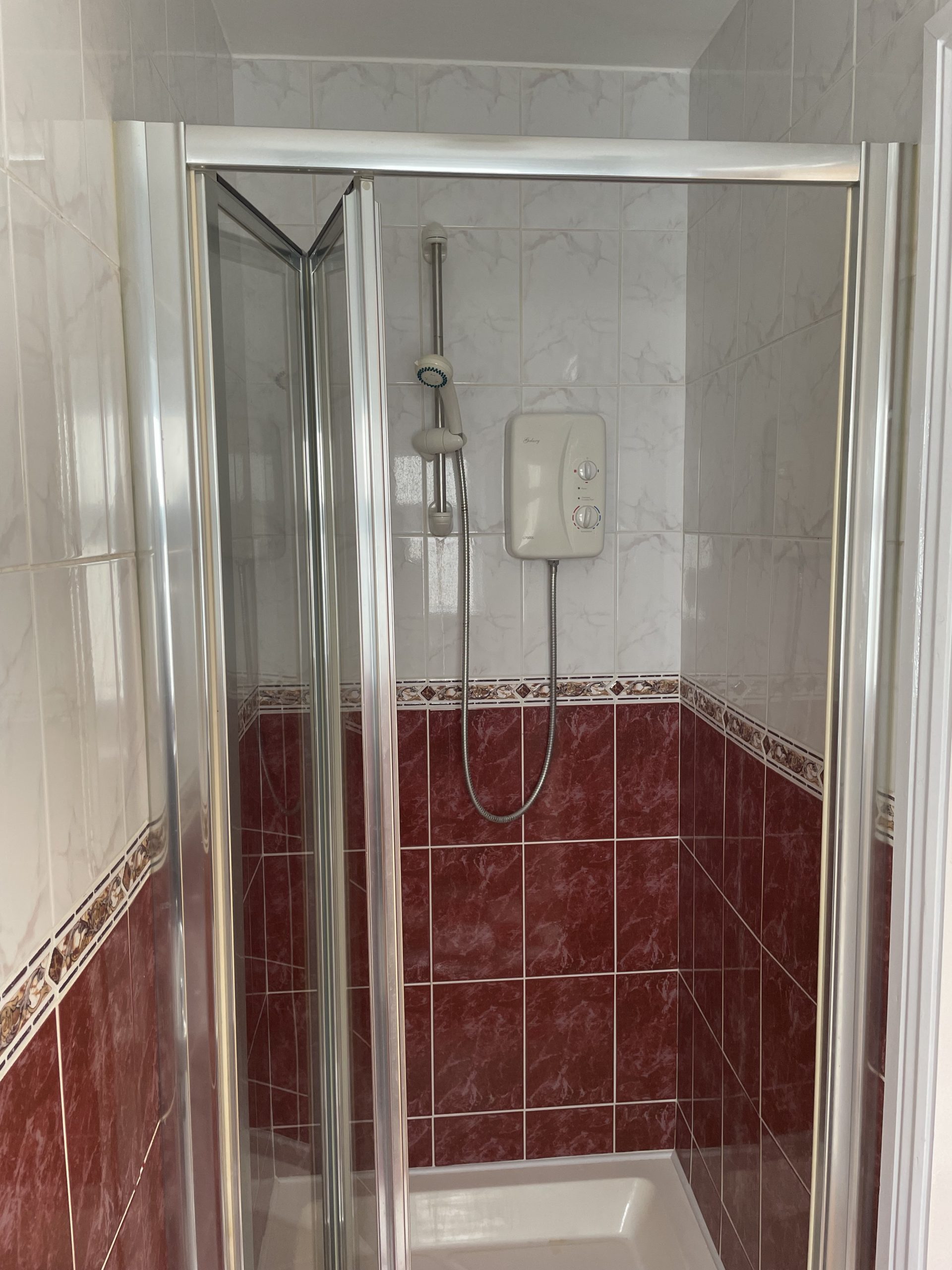 Bathroom: 2.41m x 1.68m, With floor to ceiling tiles, electric shower over bath, WC, WHB.