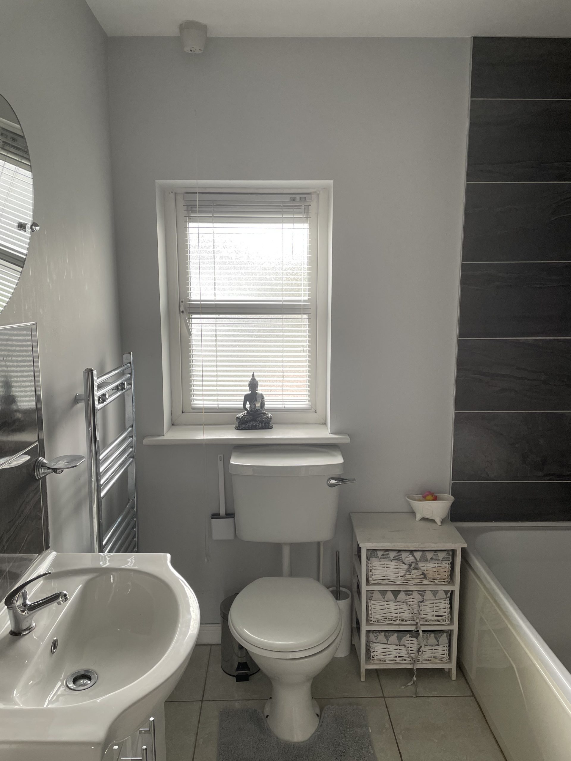 Family Bathroom: 2.03m x 1.68m, Partly tiled, electic shower over bath, WC, WHB with vanity unit, heated towel rail.
