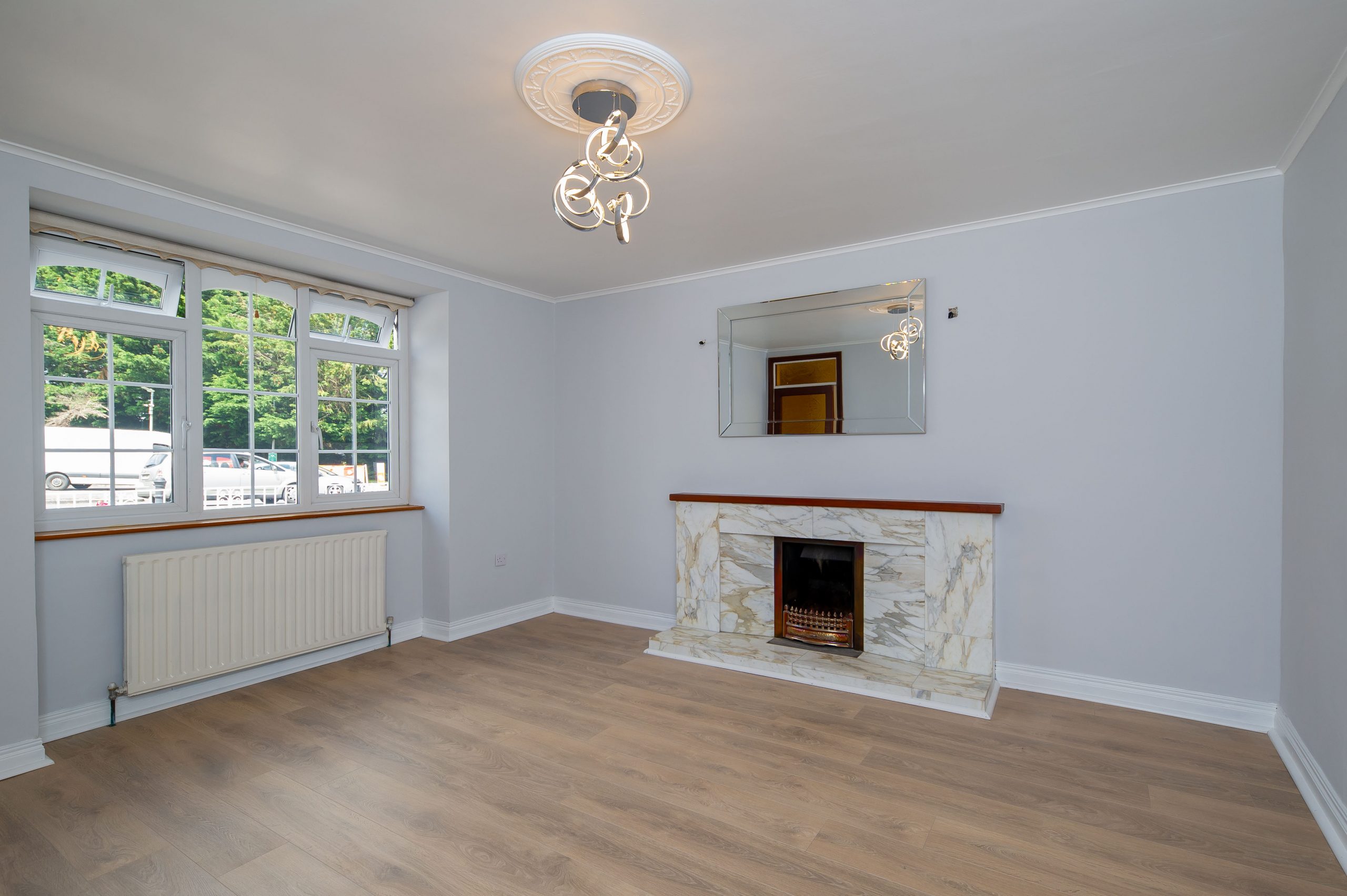 Living Room: 3.93m x 3.84m, With blonde oak flooring (12mm), marble fireplace.