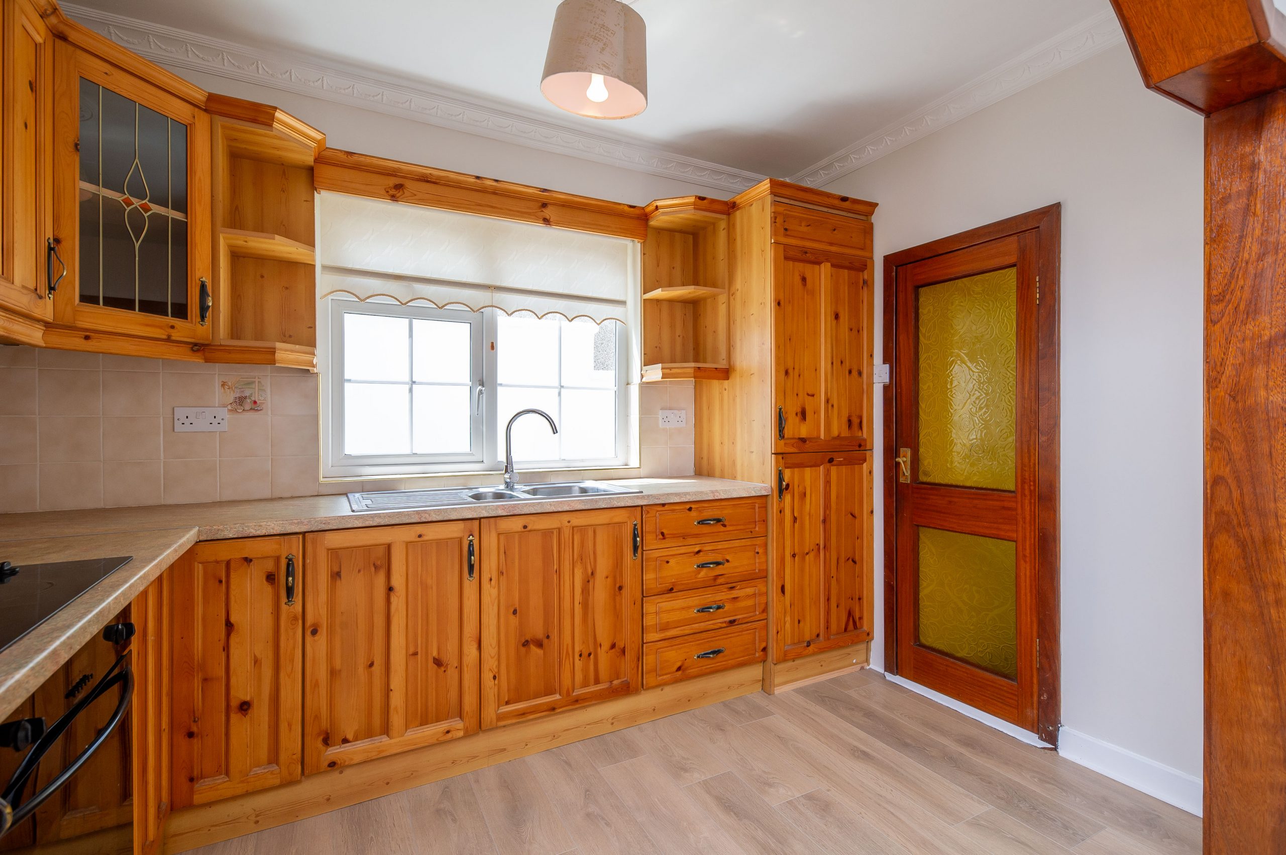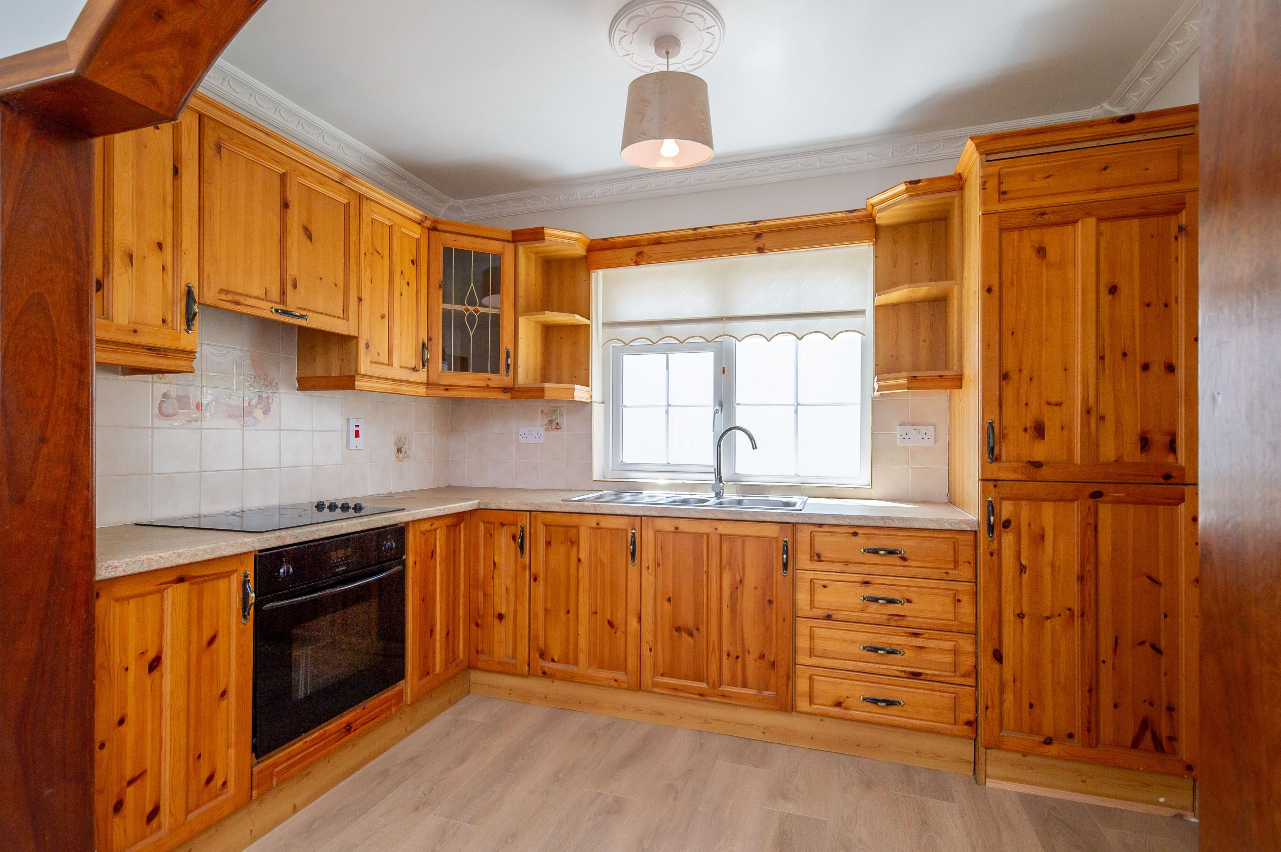 Kitchen/Dining Room: 5.93m x 3.17m, With floor & eye level units, display cabinet, tiled splashback, integrated fridge freeze, built in oven & hob.