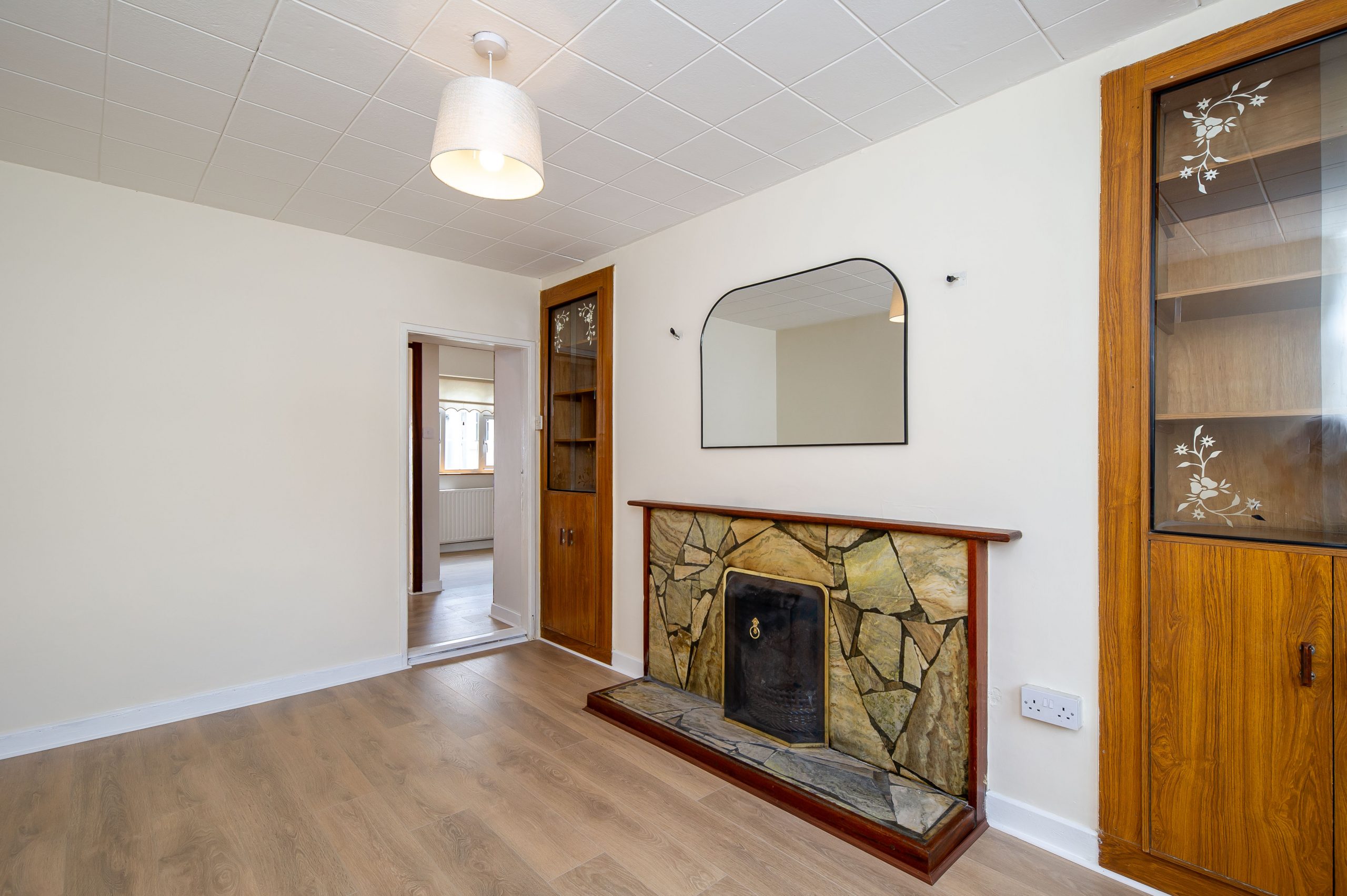TV Room: 3.94m 2.59m, With blonde oak flooring (12mm), open fireplace, built in corner cabinet.