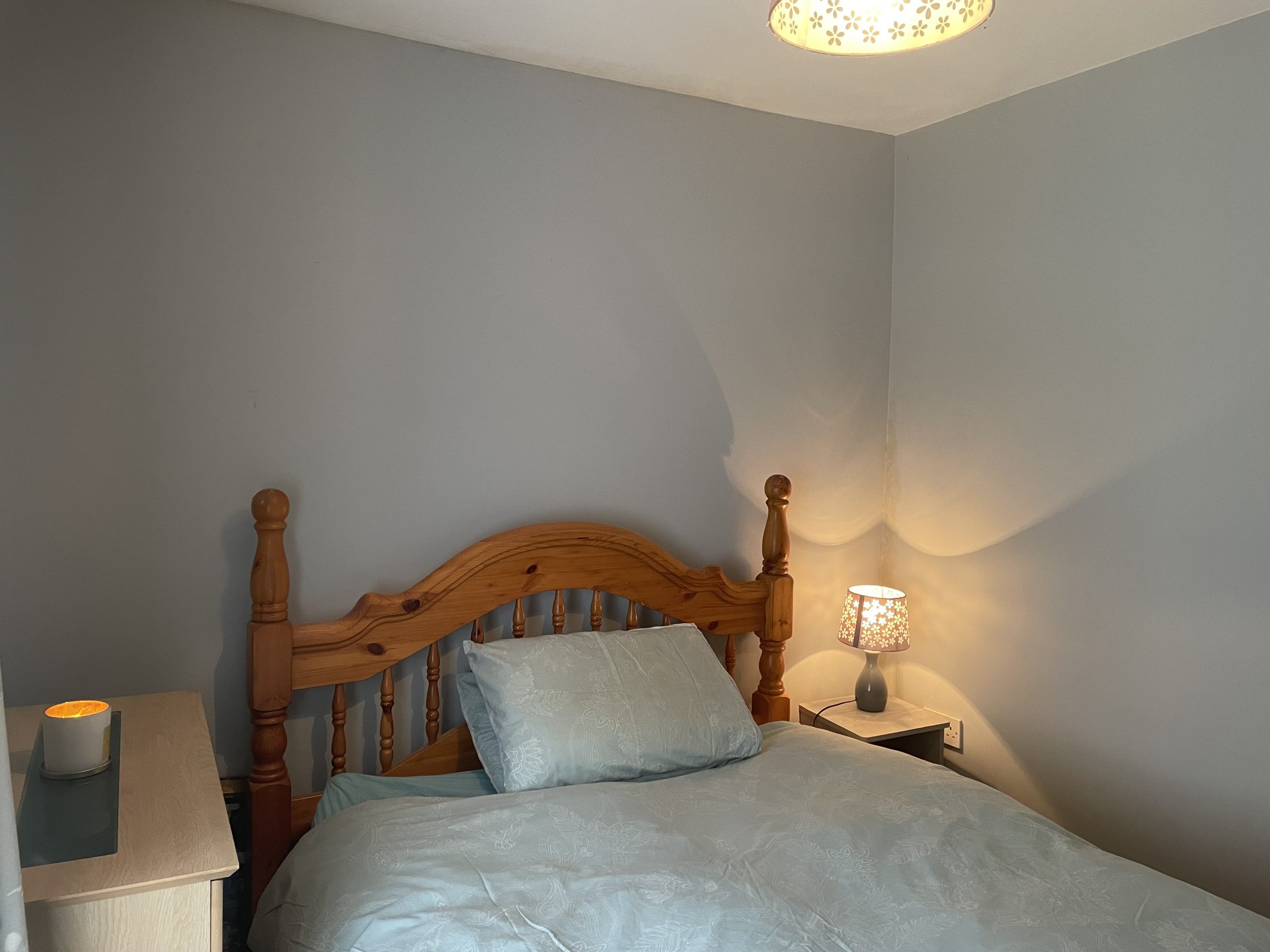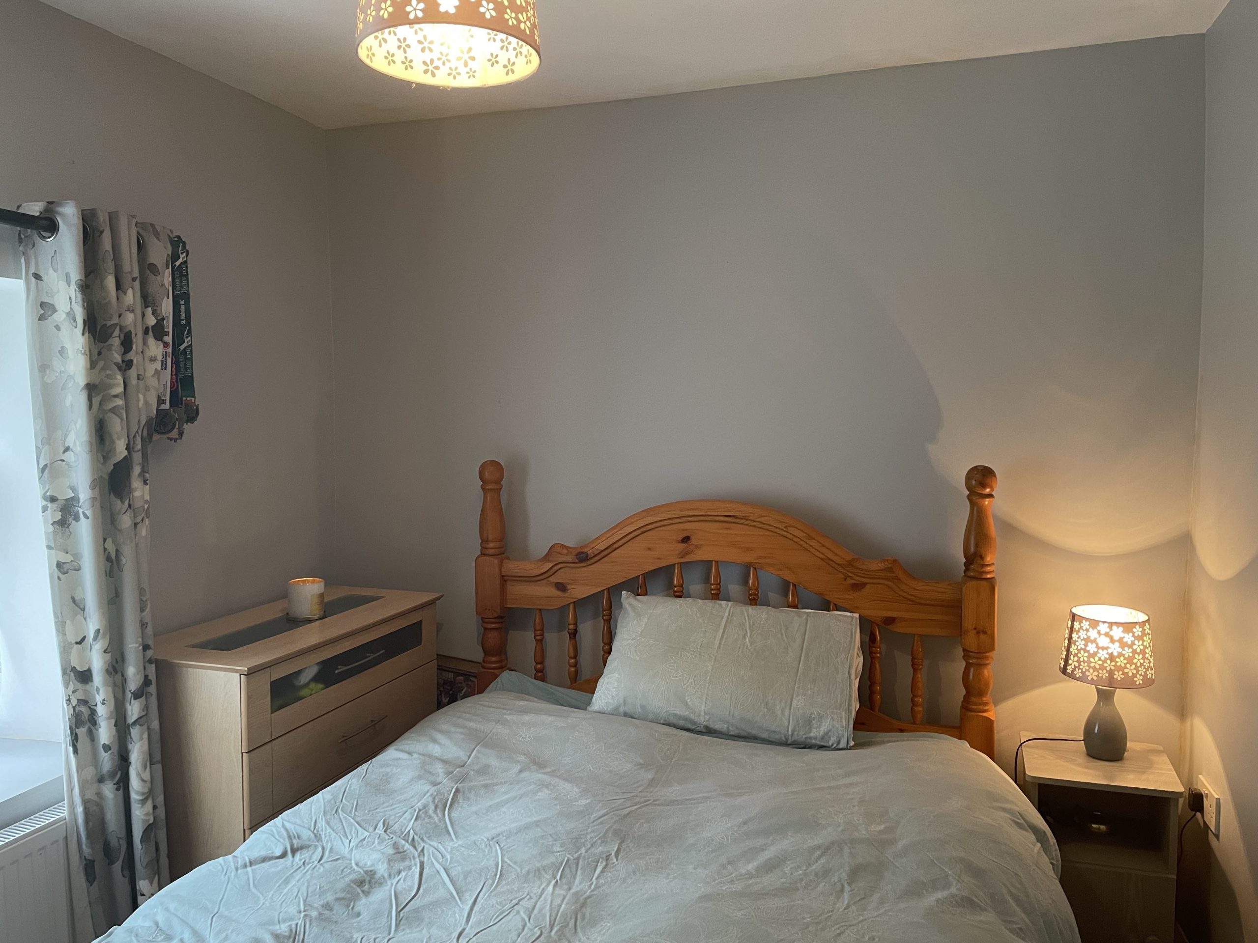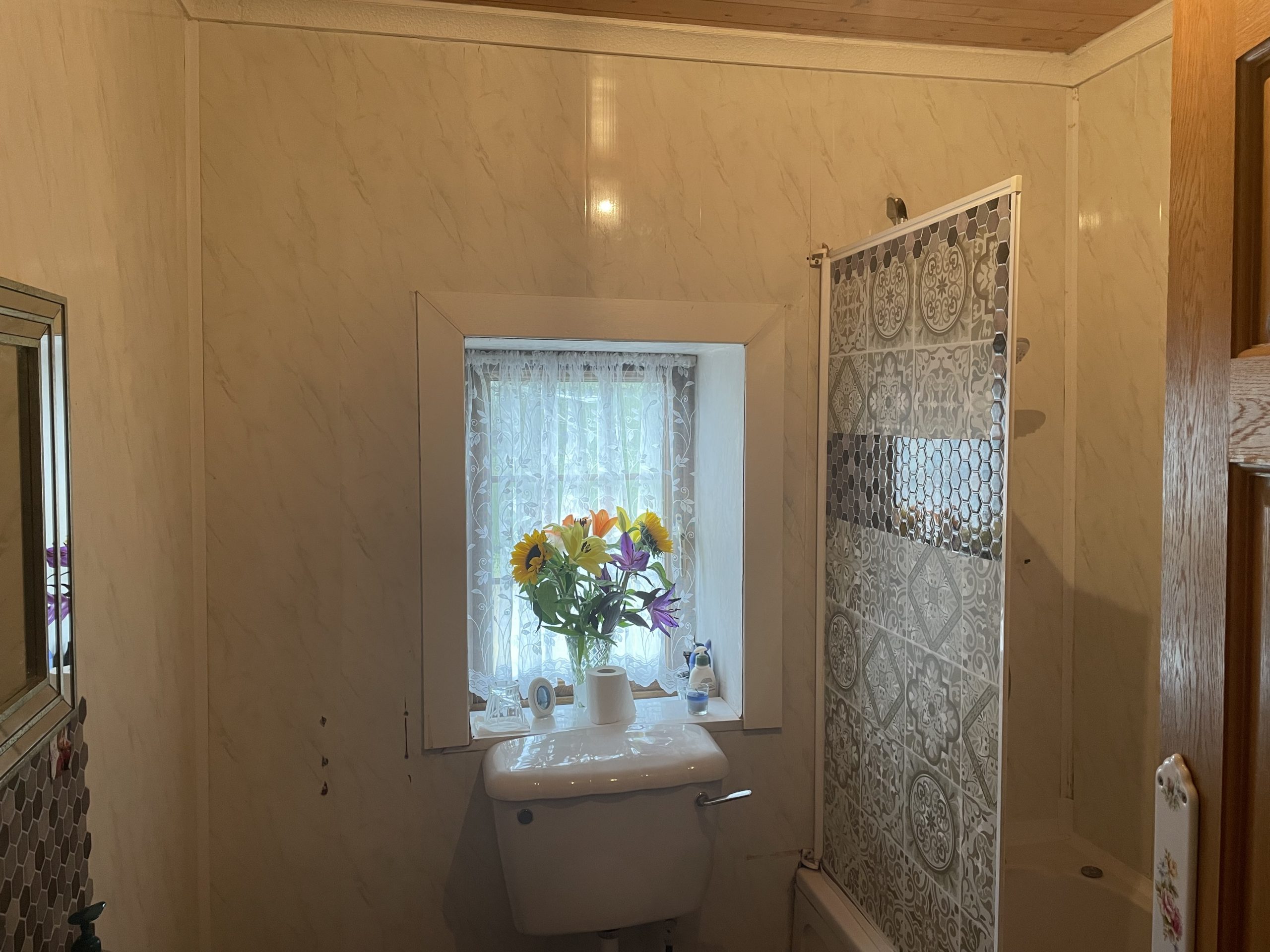 Bathroom: 1.96m x 1.94m, Fully tiled with electric shower over bath, WC, WHB.