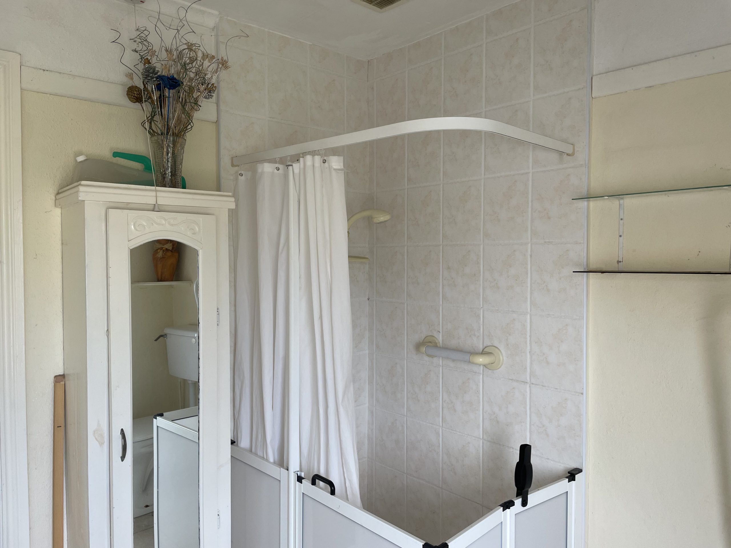 Bathroom: 2.55m x 2.43m, Partly tiled with electric shower, wash hand basin, WC.
